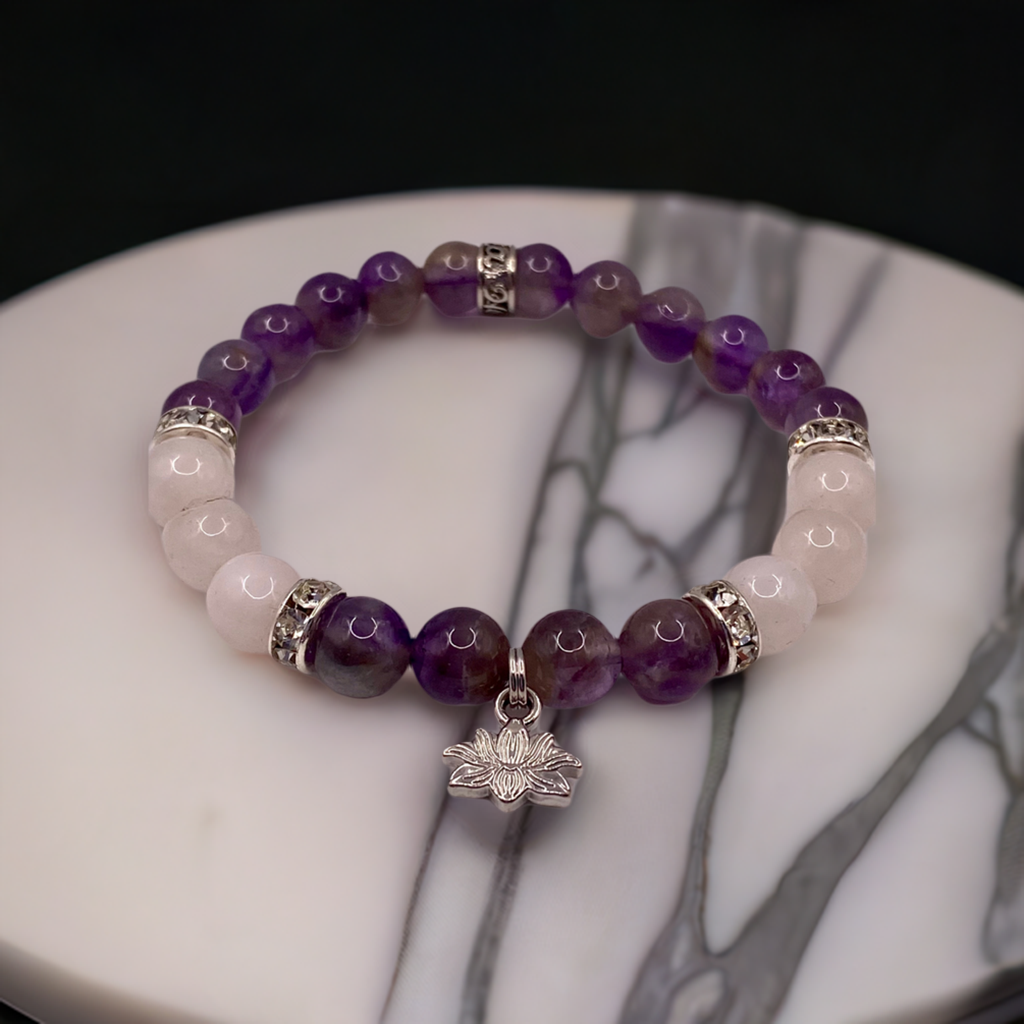 This is pretty bracelet with amethyst and rose quartz with a lotus charm for strength, rebirth, resiliency and love. One Size - fits most.