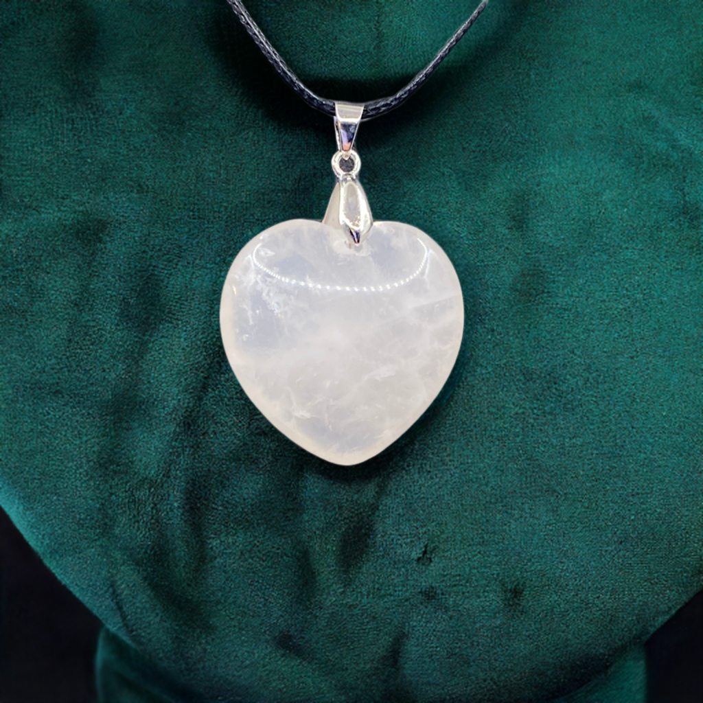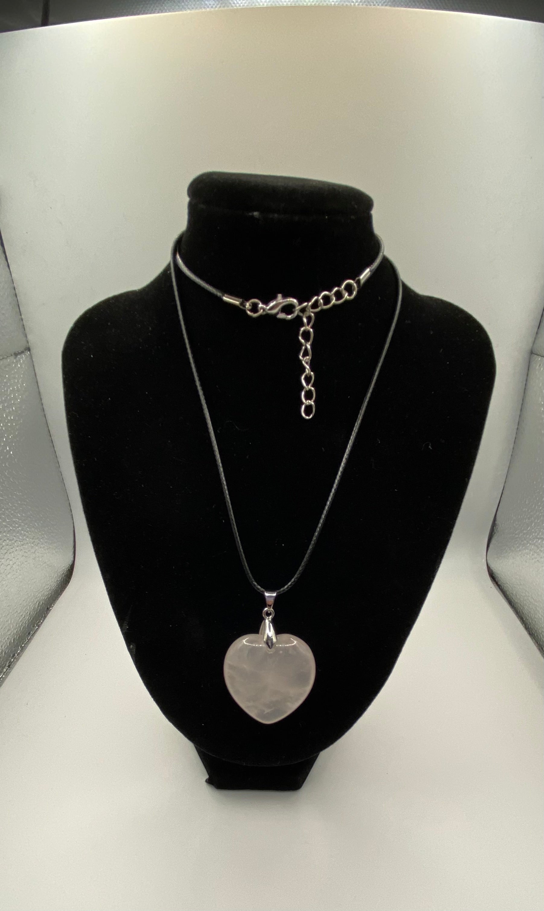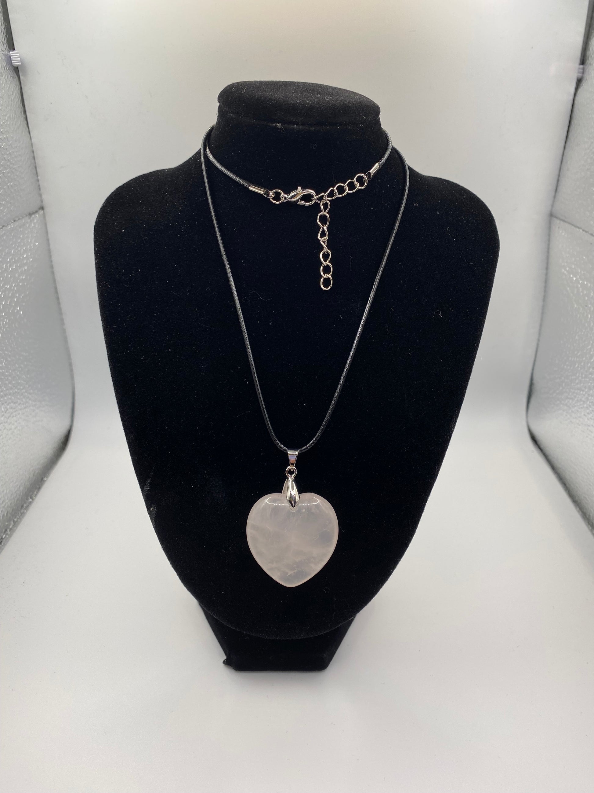 | Rose Quartz Heart on a black cord necklace is a beautiful pale pink and is approximately 1.25 inches long. Rose Quartz is known as the crystal of unconditional love. It's said to boost feelings of self-love and foster loving relationships with others. |