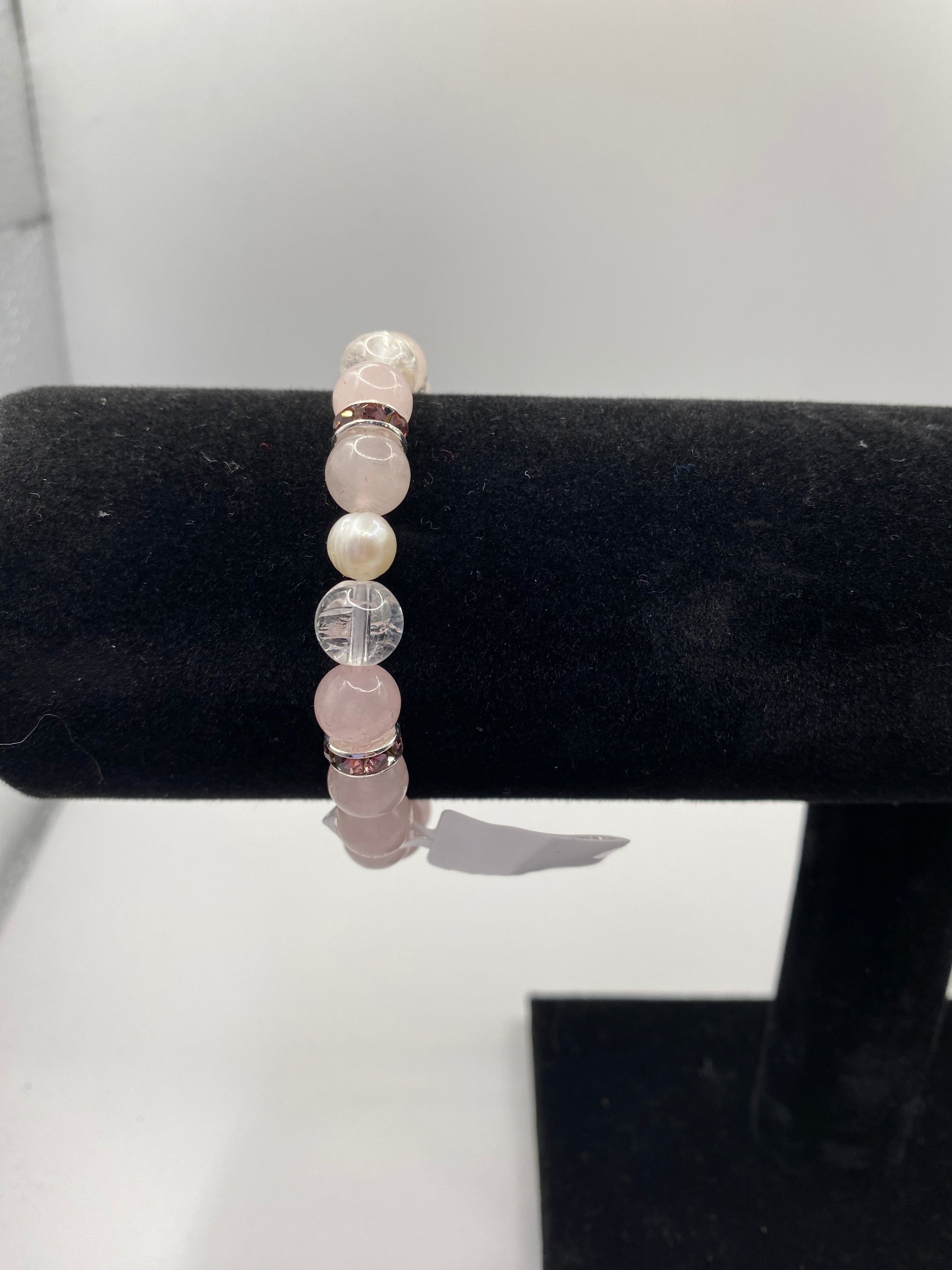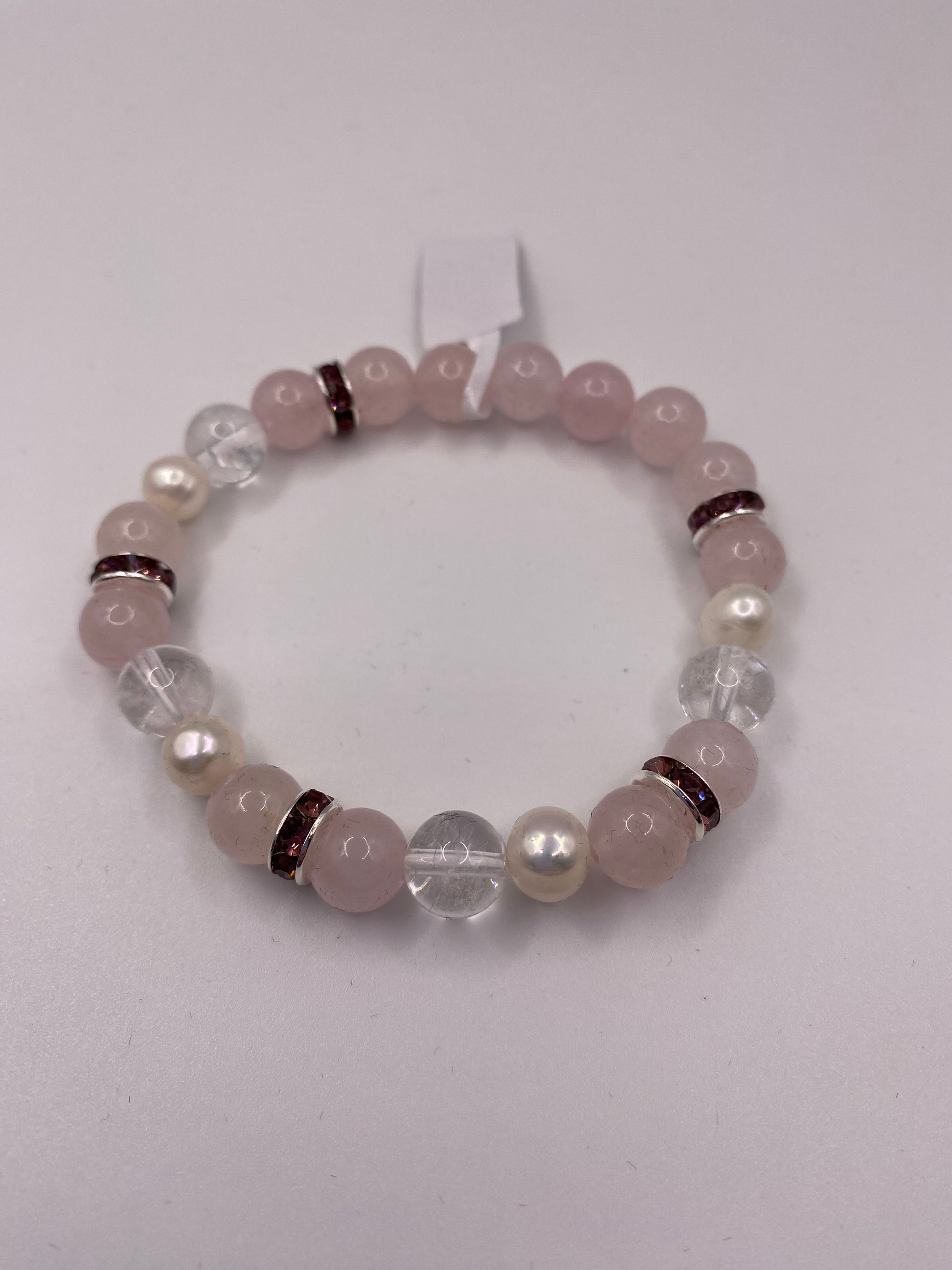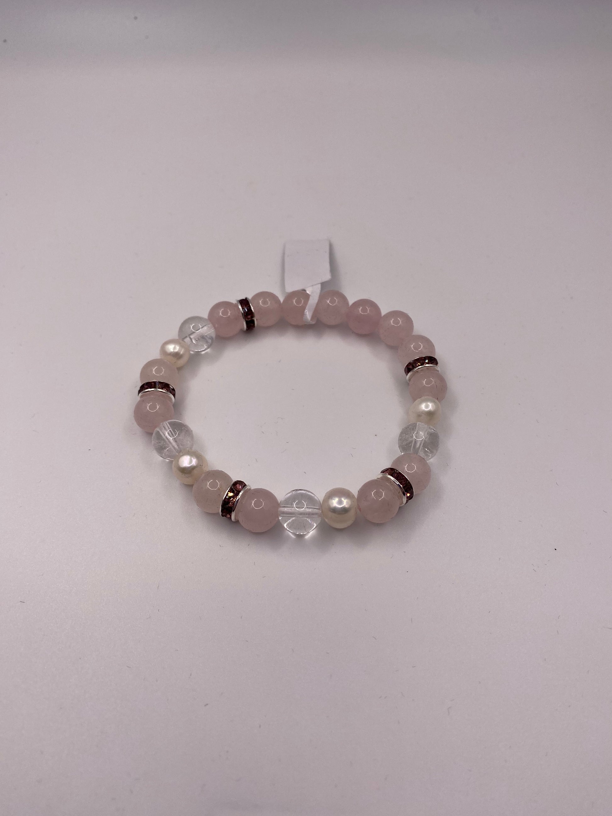| This is a super pretty bracelet with Rose Quartz and Pearl-like beads. Rose Quartz is known as the crystal of unconditional love. It's said to boost feelings of self-love and foster loving relationships with others. Pearl symbolizes balance, and inner wisdom. |